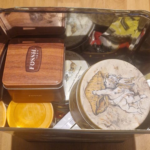 Pene og flotte pyntegjenstander på sokkel og står på stett i glasskuppel.