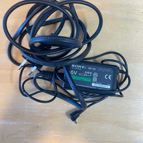 Sony PSP 5V strømadapter for lading av PlayStation Portable-enheter. Adapteren har en standard europeisk støpsel og en kabel med passende kontakt for PSP. Den leverer 5 volt strøm til enheten.