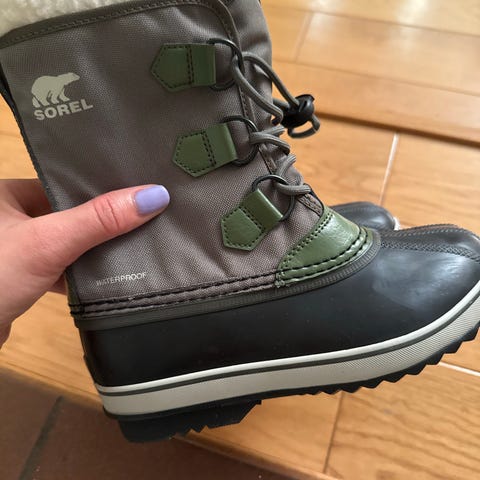 Sorel barn vintersko i størrelse 33, unisex. Skoene er brune med fôr som gir ekstra varme og komfort. Egnet for kalde værforhold.