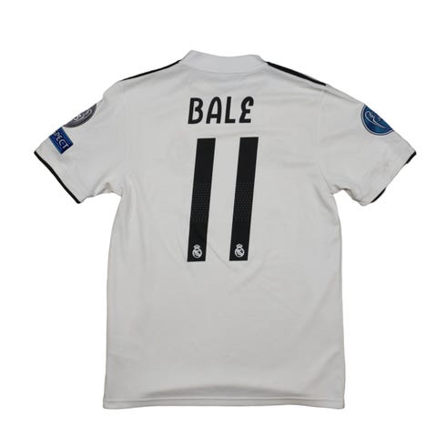 Real Madrid fotballdrakt fra sesongen 19/20 med spillernavn Bale og nummer 11 på ryggen. Drakten er mørkeblå med gullfargede detaljer, inkludert logoer og trykk. Den har LaLiga-logo på ermet og FIFA-klubbverdensmestermerke på brystet. Strøken drakt!