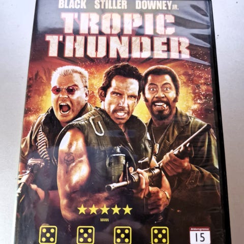 DVD-utgave av filmen Tropic Thunder med skuespillerne Black, Stiller og Downey Jr. Inneholder action- og komedieelementer. Passer for aldersgruppen 15 år og oppover.