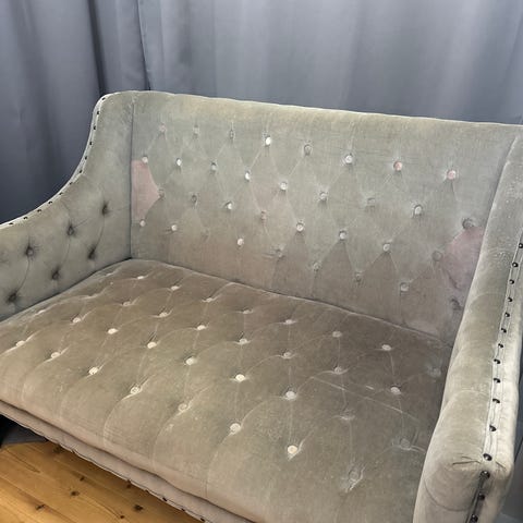 Litt bruksmerker og noen små rifter i stoffet som kan fikses om man er kyndig med nål og tråd. Nypris var totalt nesten 10.000. Sofaen kan med fordel ha en rens.