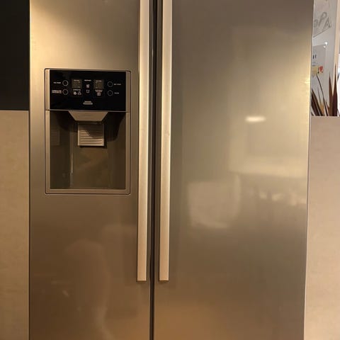 Whirlpool Side-by-Side kjøleskap med svart farge. Kjøleskapet har dobbeltdørsløsning med separate rom for kjøling og frysing. Innvendig er det flere hyller og dørhyller for organisering av matvarer. Enheten har is- og vanndispenser integrert i døren.