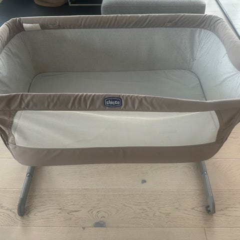 Fin, praktisk bedside crib med en myk, polstret madrass og oppbevaringsveske.