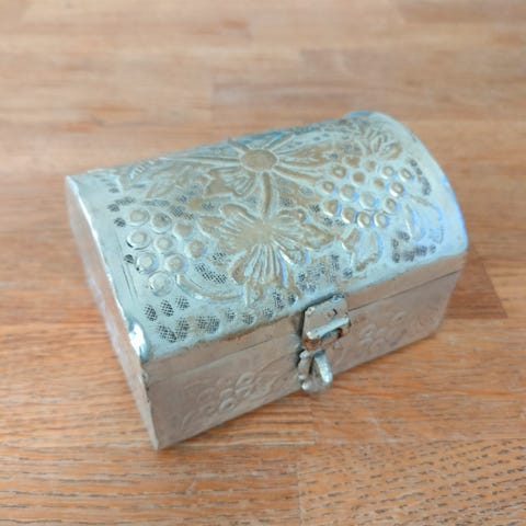 Liten kiste eller stort skrin i metall. Usikker på alder og opprinnelse men er nok et eldre skrin. Ser ut som om det kan være malt en gangEr ikke tung. Lengde 41 cm. Bredde 22 cm. Høyde 23 cm. Har den siste tiden brukt som verktøy skrin