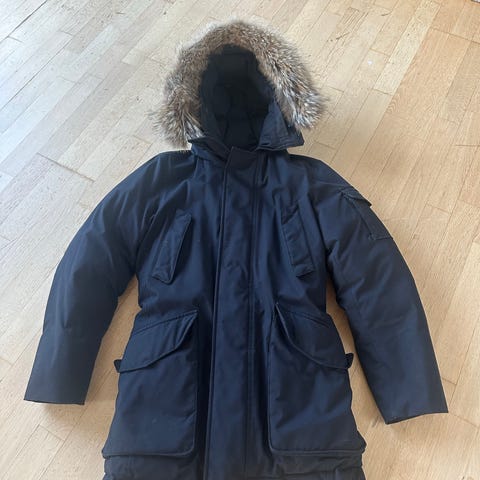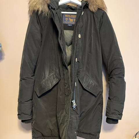 Jakken er svart og har hette med ekte pels som man enkelt kan ta av om man ønsker det.
