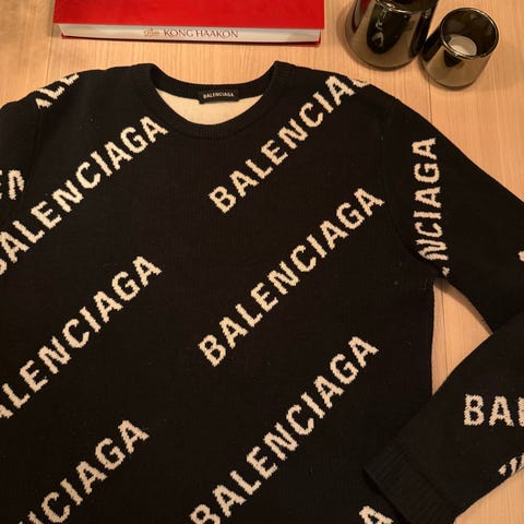 Balenciaga ullgenser i blå farge, størrelse S for herre (Balenciaga S, vil si den passer en L-XL men perfekt for sånne som meg som liker oversized. Genseren er laget av ullmateriale og har Balenciaga-logo trykt over hele plagget. Ble kjøpt på Balenciaga butikken i Oslo i 2022 for 10 299kr. Brukt 4-5 ganger (Bilde vedlagt er meg som bruker genseren). Skambud blir ignorert. Kan sendes.