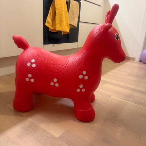 Yngri hoppdyr i grønn farge laget av mykt materiale. Passer for barn som leker og utvikler balanse og koordinasjon.