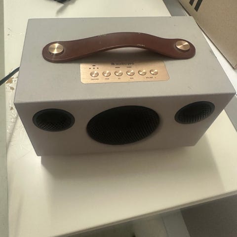 Høyttaler: 15,8 × 8 × 10,4 cm, 700 gram.