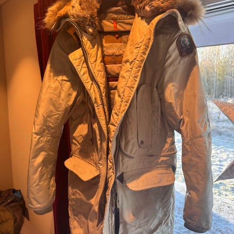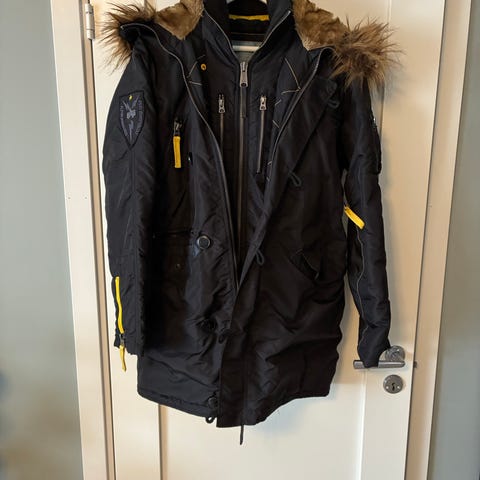 Parajumpers Large vinterjakke i olivengrønn farge med pelshette. Str L. Noen bruksmerker. Et lite hull og flekk som vist på bilde. Nylig renset.