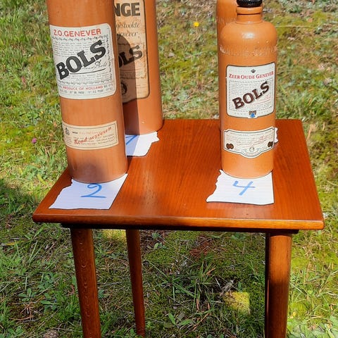 Flasken er i brunt steingods med tydelig preget tekst i godset. Dette er en klassisk genever-/brennevinflaske brukt til eksport. Fin patina og autentisk preg.