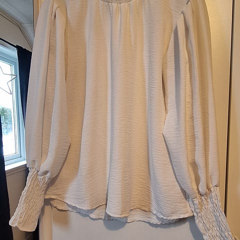 Blusen er som ny, med fine sømdetaljer, se bilder. Mål skuldre midt bak 41 cm. Lengde midt bak 57 cm. Erme: 44 cm.