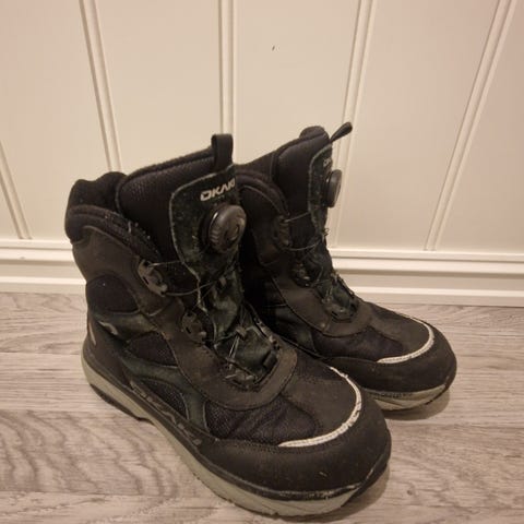 Okaki rosa vintersko/-støvler i størrelse 39. Skoene har isolerende materiale og er designet for å holde føttene varme i kalde forhold. Yttersålen har godt grep for bruk på snø og is. De ble kjøpt midt i vintersesongen i fjor, og er derfor ikke mye brukt. Den høyre skoen har fått en ripe som vist på bildet, men ellers er de hele og fine.