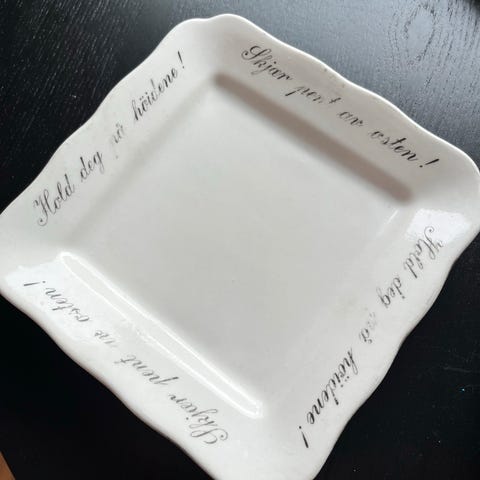 Oste fatet er hvitt med på skriften i svart "Skjær pent av osten" og "Hold deg på höidene" rundt kanten, samt gullkant rundt hele fatet. Fatet har kvadratisk form med avrundede hjørner. På baksiden er det grønt stempel med porsgren (kvist med grener) og bokstevene S på en side og P på den andre siden. Stempelet betyr at det er Porsgrund sanitær porselen og stempelet ble brukt mellom 1948 og 1952. Mål: 18x18 cm. Vekt: 380g. Fatet er helt og pent, men gullkanten og noe av teksten er noe alders preget. Selges kr. 100.-