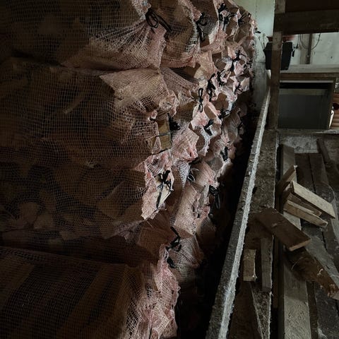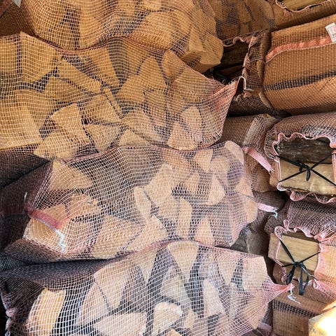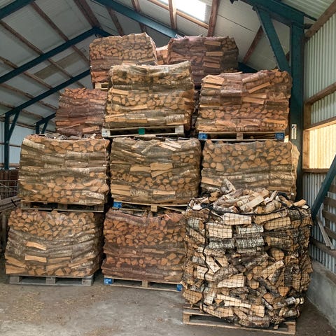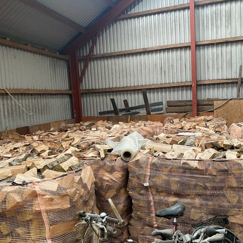Blandingsved av ulike løvtre, lerk, normannsgran, norsk gran. Fin ved, håndlødd i sekken, fulle sekker. En sekk inneholder i overkant av en halv favn.