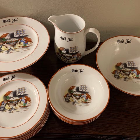 Selger hele serviset som er igjen. Ønsker å selge samlet. Og bør da hentes på Jessheim. Har 6 middagstallerkner, 6 store dype, 2 små skåler, 2 dype skåler, 1 stort serveringsfat, salt/pepper bøsse og et stort sausenebb. Samlet 2500. Men åpen for bud!