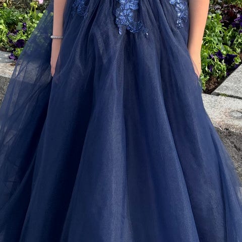 Har en nydelig Alexandra Ritzi ballkjole i fargen jeansblå tror jeg den heter. Var ikke lett å få rett farge fram men ikke helt lyseblå og ikke grå . Størrelse xxs-s/m pga knyting.