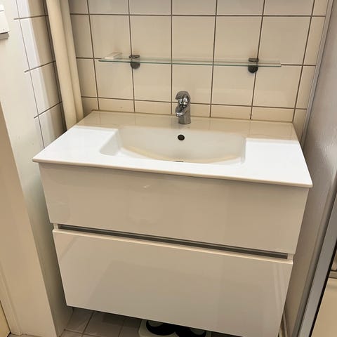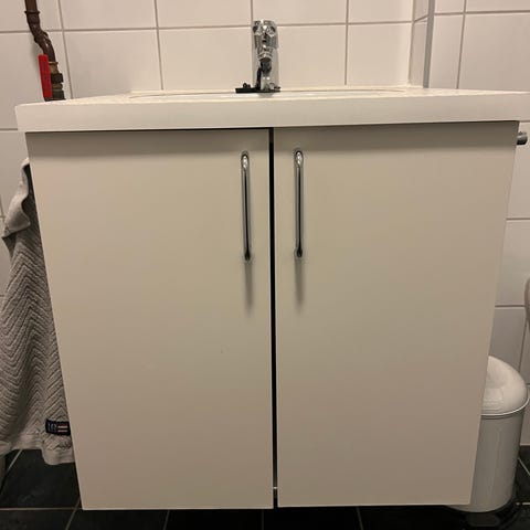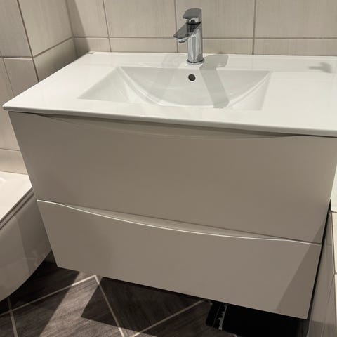 Baderomsmøbel (80 cm i bredde) med integrert vask og to skuffer. Produktet er hvitt og laget for oppbevaring i baderom. Passer for standard baderomsbruk.