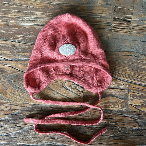 Grønn strikket hjelmlue - veldig søt! Passet fra ca 7 mnd til tre år her