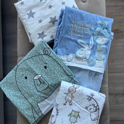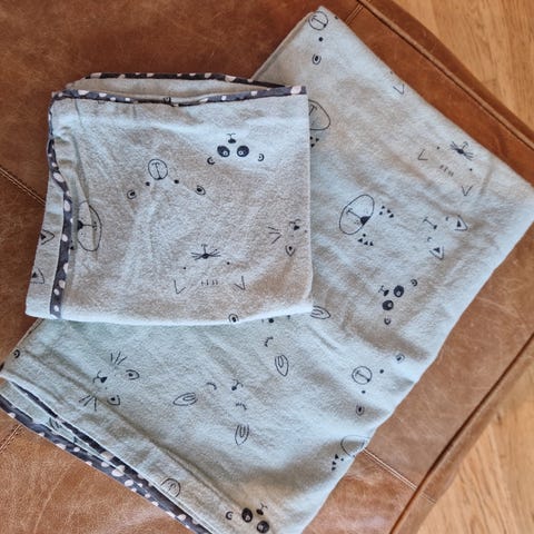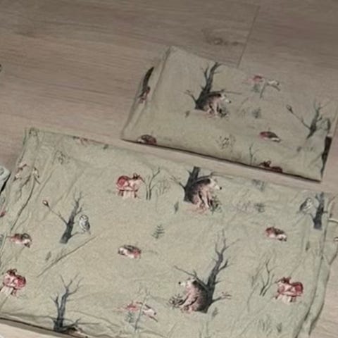 NameIt NBN Frey babysengetøy i nydelig mønster. Behagelig og myk bomull (70% økologisk og 30% vanlig). Inkluderer pute og dyntrekk samt oppbevaringsnett. Str 35x40 cm og 80x100 cm. Kun vasket og brettet, aldri brukt da vi hadde så mange sengetrekk