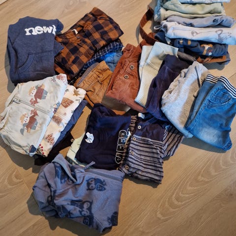 Selger en klespakke med diverse til gutt i str. 68 som kan dekke det du trenger 😊 Godt variert innhold fra ulike merker. Det er også noen finklær i pakken, i form av skjorter og en vest.