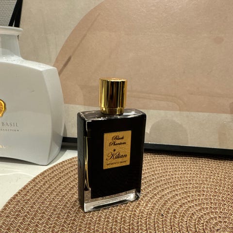 Kilian Black Phantom Eau de Parfum i 10 ml flaske. Parfymen kommer i en glassflaske med dekorativt mønster og sort kork. Egnet for bruk som duft.