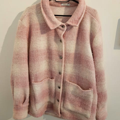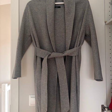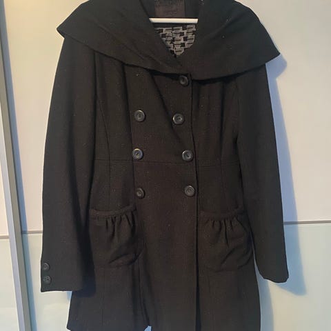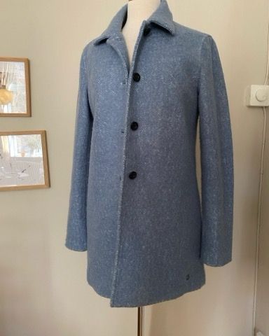 Skogsgrønn ullkåpe fra Nümph i boucle stoff - litt oversized modell, så den kan brukes av både 34 og 36. Skjulte knapper.