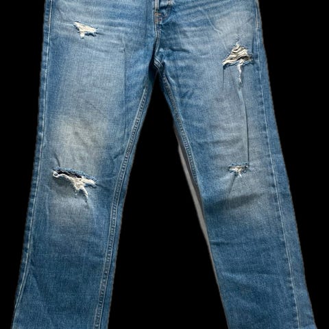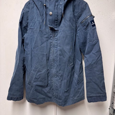 Godt brukt men fullt ut brukbar. En knapp på skulderen mangler men det finnes reserveknapp som kan sys på. Den er lappet på innsiden nede ved livet på begge sider.