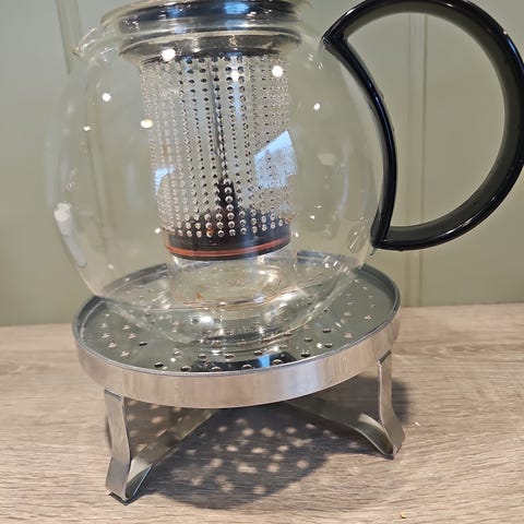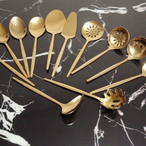 Inkluderer flere redskaper som øse, sleiver, stekespader, tang m.m., samt stativ.