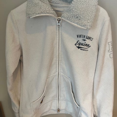 Kingsland hettegenser 146/152, grå-grønn farge. Kun brukt én uke på rideleir. Ingen feil, mangler eller slitasje -fremstår som ny.