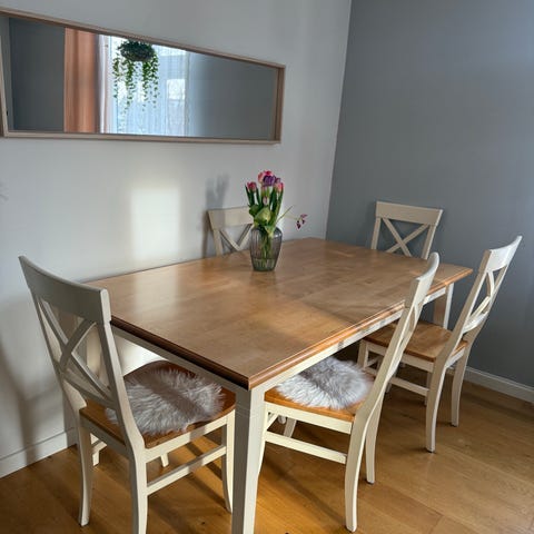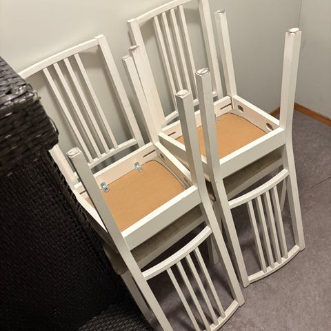 Gir bort fem stoler fra IKEA. Har hvite trekk til 4 stoler og 5 trekk av den oker/gul lignende