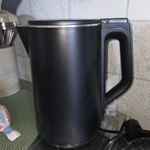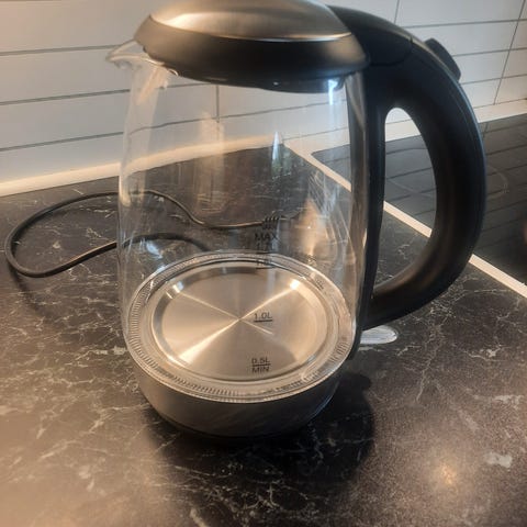Electrolux vannkoker med glasskropp og detaljer i rustfritt stål. Utstyrt med håndtak i svart plast og måleskala for vannmengde. Egnet for oppvarming av vann til drikke og matlaging.