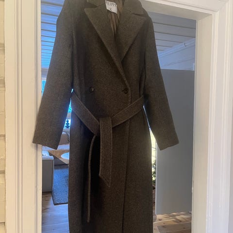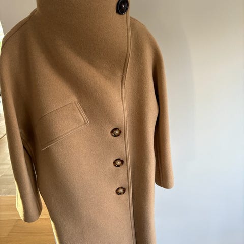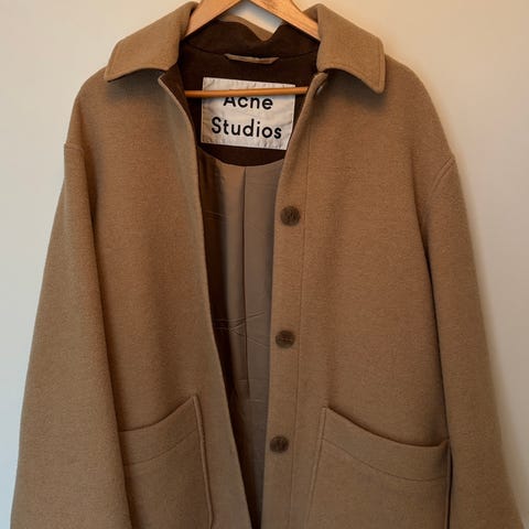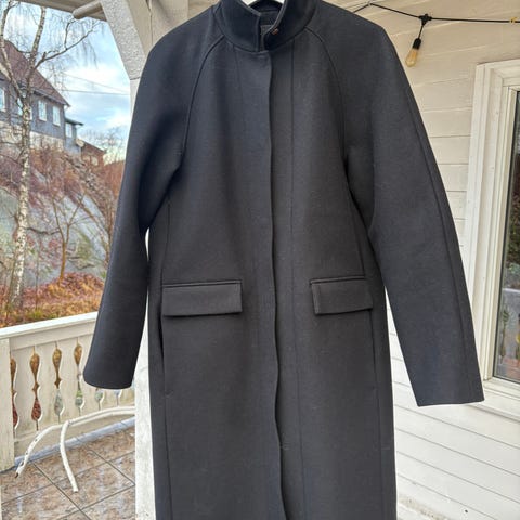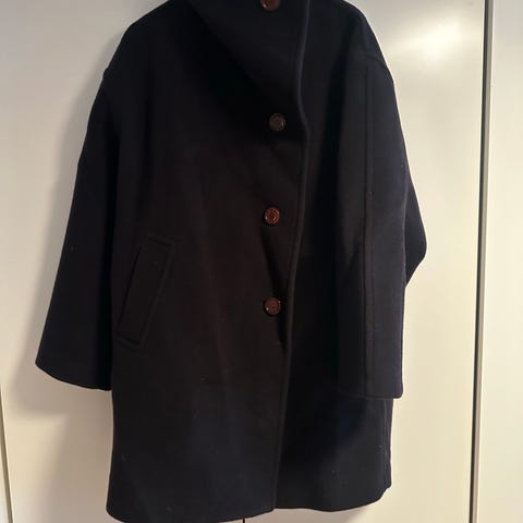 Flott ullkåpe fra Acne Studios str M (str 40) i svart farge. Kåpen har et klassisk design med knappelukking og lommer på sidene .Veldig pent brukt. Kan sende med Postnord for 69kr .