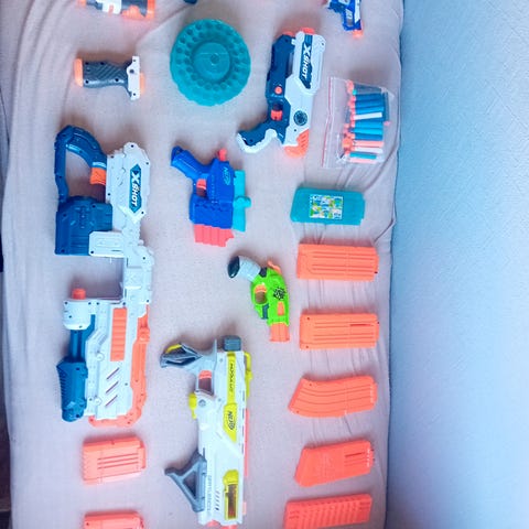 Nerf leker i ulike modeller og farger. Inkluderer flere typer lekepistoler og geværer i plastmateriale, egnet for barn.