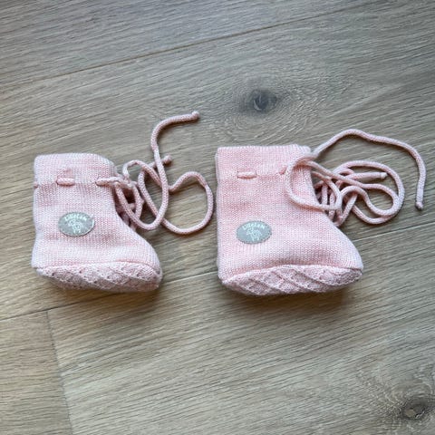 Pent brukte grå lillelam tøfler med knytting.