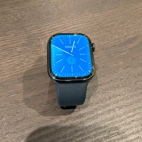 Apple Watch Series 10 smartklokke med svart reim. Enheten har funksjoner for pulsmåling, skritteller og visning av tid og dato. Kommer med original emballasje og lader. Remen er M/L