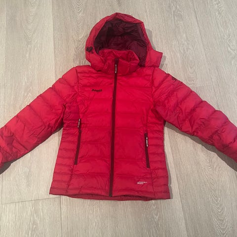 Bergans dunjakke, 7623 Down Youth, for barn i størrelse 152, designet for jenter. Jakken er blå og laget av dunmateriale, som gir isolasjon og varme. Ingen hull eller rifter.