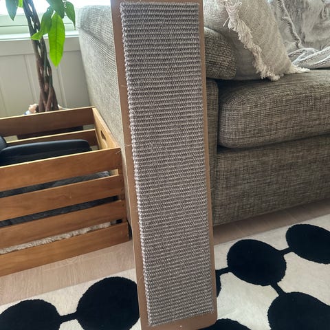 Kattestativ med kloreflate i beige farge. Har en hengende lekeball og en buet base. Passer for katter som trenger kloremulighet og lekeaktivitet. Ble kjøpt til katten vår, men den likte bedre å kvesse klørne på stolen, og har derfor blitt svært lite brukt. Kjøpt ny på Buddy i November 2025. Nypris 1200kr