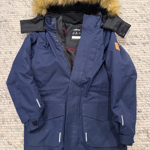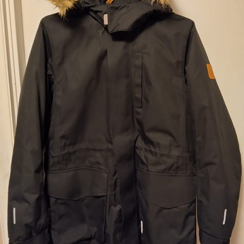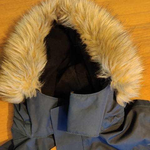 Veldig god vinter/vår/høstjakke, har vært en favoritt og har derfor et par små bruksmerker på ermene og på refleksmerket bak (se nærbilder). Man kan variere hvordan jakken ser ut pga. avtagbar hette, og også avtagbar pels. Jakken kan såklart også brukes til jenter.