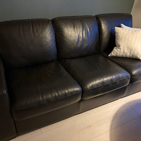 Lekker sofagruppe i høy kvalitet selges grunnet flytting. Mørk brun farge, 3 + 2 seter.