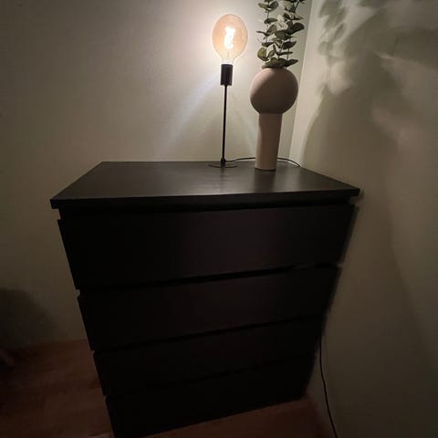To lyslaserte kommoder fra IKEA. Fire skuffer og en hylle. Alle skuffer virker og er i godt hold. Har med bakhengsler slik at de kan festes til vegg ved behov.
