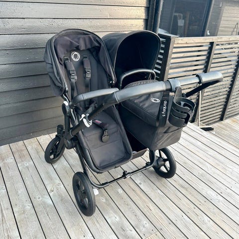 Bugaboo Duet Barnevogn dobbel med grå stoff. Designet for to barn samtidig med separate seter og sikkerhetsbelter. Passer for familier med tvillinger eller barn i nær alder. Praktisk for by- og utendørs bruk med fire hjul og justerbare seter.