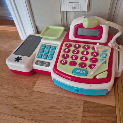 Pent brukt kasseapparat med kalkulator, lyd, lys og lekepenger.