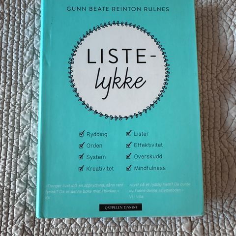 Listelykke er en bok med fokus på rydding, orden, system, lister, effektivitet, overskudd og motivasjon. Boken inneholder metoder og tips for å organisere og strukturere hverdagen bedre.