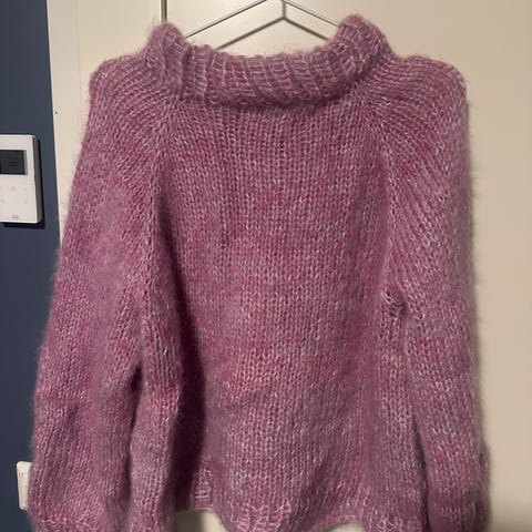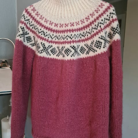 Leonora genser. Den er strikket i Fauna garn. Den er ikke brukt. Omkrets 100cm. Lengde fra under arm 42 cm. Hel lengde 54 cm. Jeg har en litt annerledes raglandfelling og en annen hals.