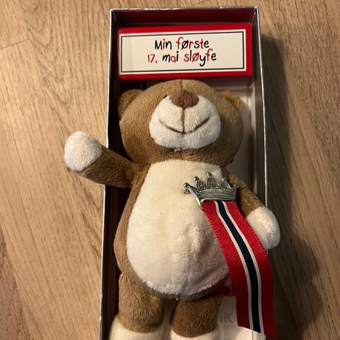 Helt ny "Min første 17-mai sløyfe" selges. Uåpnet i original eske, kjøpt hos gullsmed. Bamsen er godkjent for barn, sløyfen har kronedetalj i tinn.