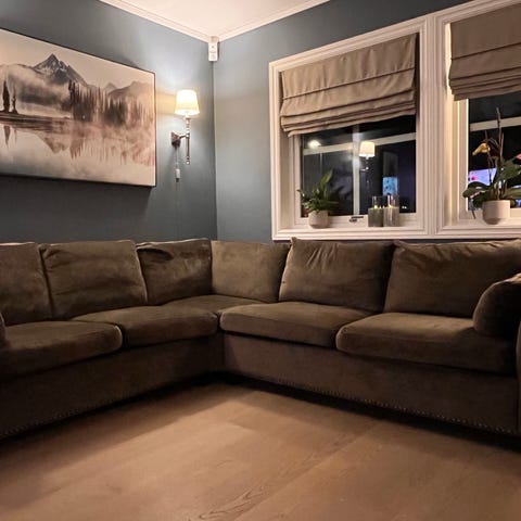Ser ut som veldig fargeforskjell på bildene.Er ikke slik i virkeligheten. 3 små puter følger med .