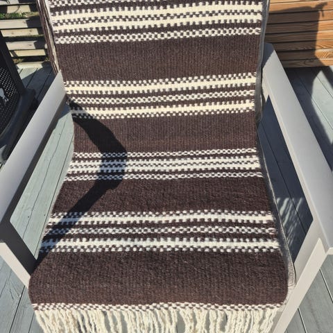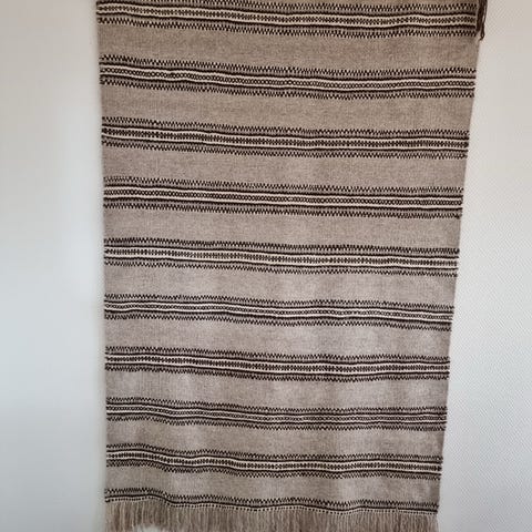 Kan vaskes ( min mor gjorde det med den som hang på hytten(pga peis luft) - håndvask i badekaret. Det er en forbindelse mellom veveren og min mors familie. Veveren vevde også en mindre grene samt en unik flerfarget en, med Naturfarget garn!