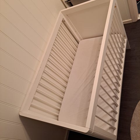 Troll Sprinkelseng i hvit. Pent brukt til 1 barn, madrass kan følge med om ønskelig. Mål 61x120cm. Et lite merke som vist på bilde ellers i god stand. Sengen kan justeres i 3 ulike nivå.