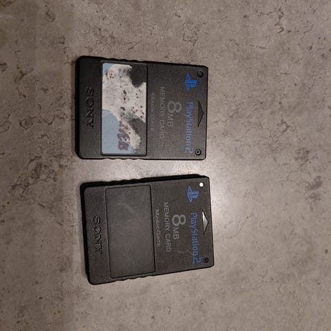 Sony PlayStation 2 8MB Memory Card for saving game data. Compatible with PlayStation 2 console. Black color, standard size and design for PlayStation 2 memory cards.
